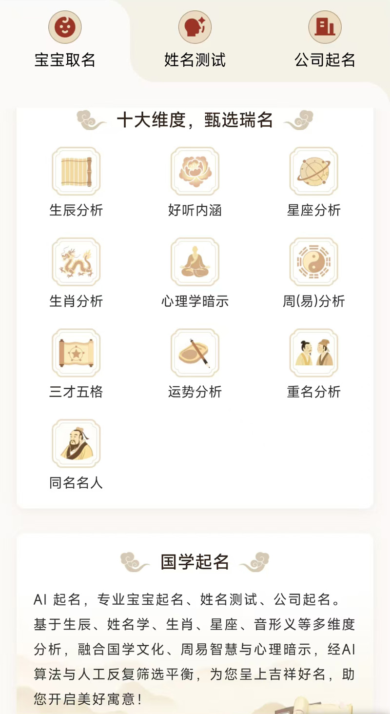 现在我们把deepseek大模型作为底座,对国学经典(如《诗经》《论语》)、诗歌经典(如《楚辞》《唐诗宋词》)、周易五行与命理类(如《周易》《生肖命理典籍》)、生肖、星座等知识进行全面学习训练,AI起名大模型知识更全面,取名更科学,只为能给大家取个万里挑一的祥瑞好名。